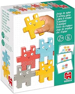 Divertido juego de apilar conejitos de madera de diferentes colores; Contiene 5 cartas de ejemplos impresas por las dos caras